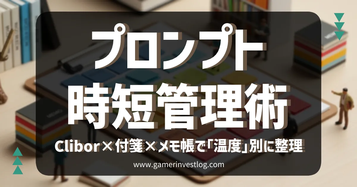 付箋は短いメモ、Cliborは完成したプロンプトの即呼び出し、メモ帳は編集用、Notionは長期保存。それぞれに役割を持たせることで、思考を中断せずにAIを操作できる環境が整います。ゲームで言えば、装備を用途別に揃えておく感覚に近いかもしれません。