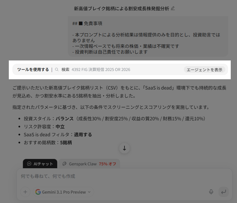 今回のテーマは「SaaS is dead」。AIエージェントの台頭によって従来型SaaS企業が売られやすい局面を想定し、その影響を受けにくい割安成長株をAIに探させるという設計になっています。