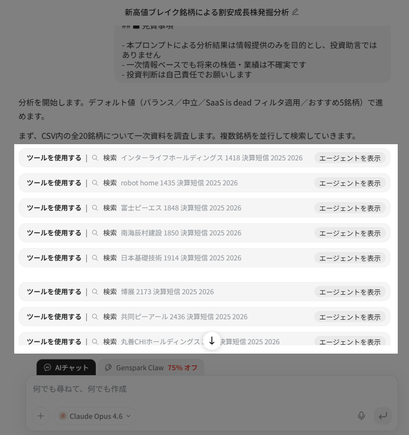 | Claude Opus 4.6 | Genspark AI Chat | Web検索で各銘柄の決算短信を個別に取得 |